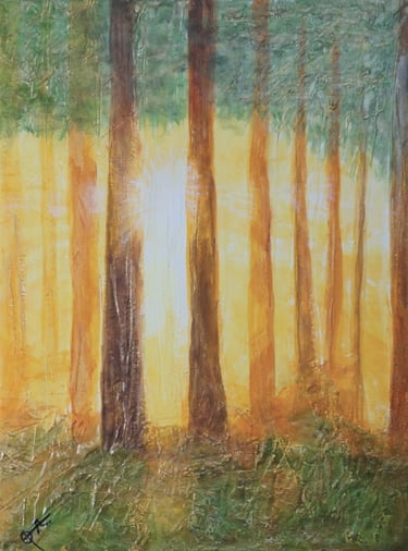 — À l’aube, la lumière s’étire sur les pins, éveillant une promesse nouvelle dans le calme du matin.