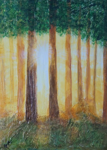 — À l’aube, la lumière s’étire sur les pins, éveillant une promesse nouvelle dans le calme du matin.